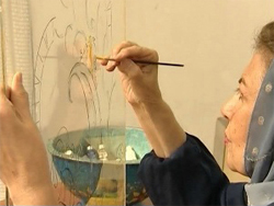 Reverse glass painting is an art form consisting of applying paint to a piece of glass and then viewing the image by turning the glass over and looking through the glass at the image. The method is challenging because the final layer of the image must be painted first. For example, in painting a face, the pupil of an eye must be painted on the back of the glass before the iris, exactly the opposite of normal painting. If this is neglected the artist will not be able to correct the error.